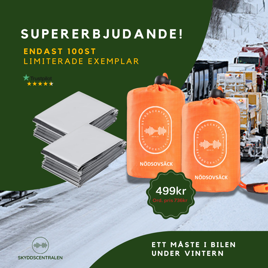 - 2st Nödsovsäckar – För att hålla värmen när temperaturen sjunker.