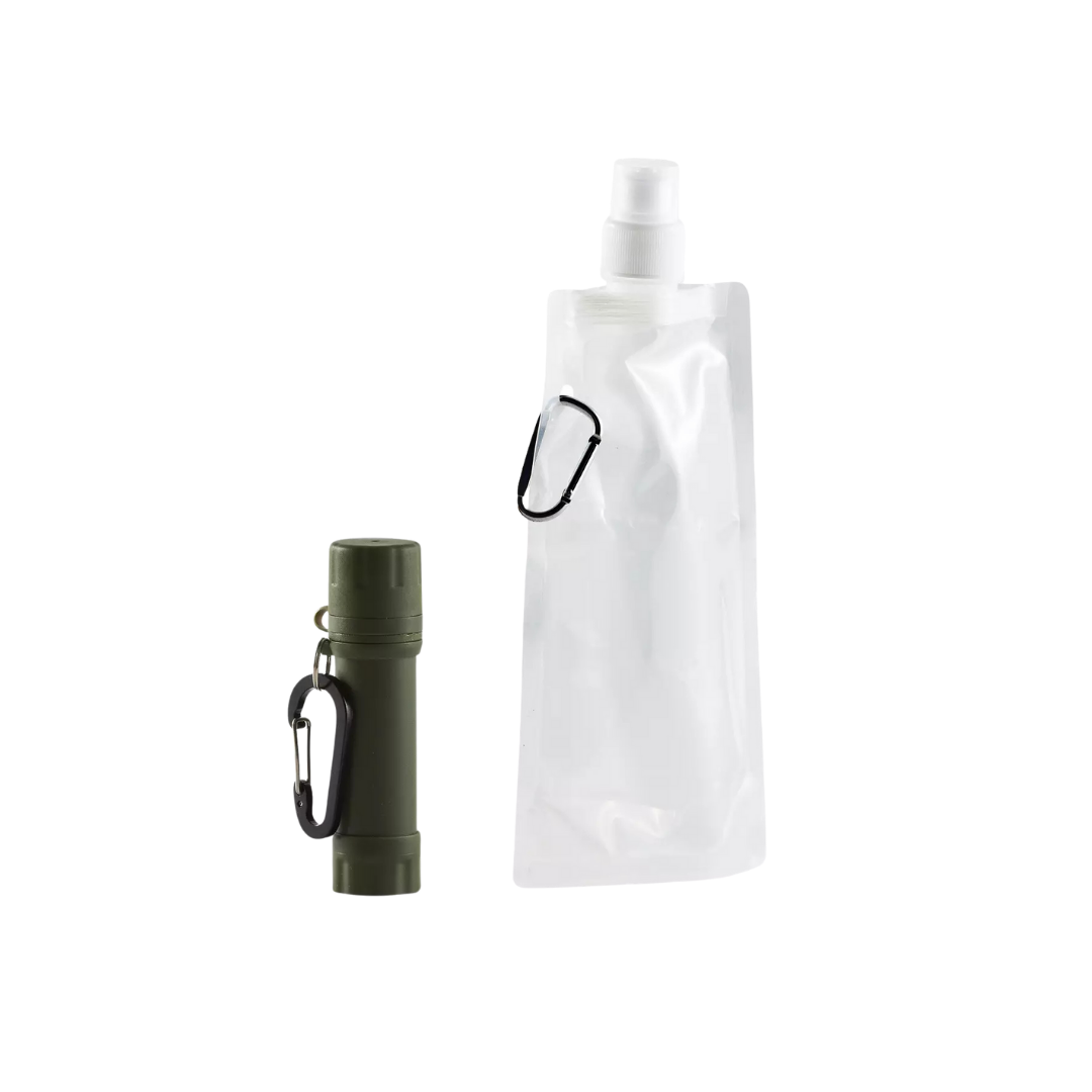 Vattenrenaren är väldigt lättanvänd och kan antingen användas med det medföljande sugröret alternativt anslutas till en PET-flaska. Hopvikbar flaska om 400ml medföljer.